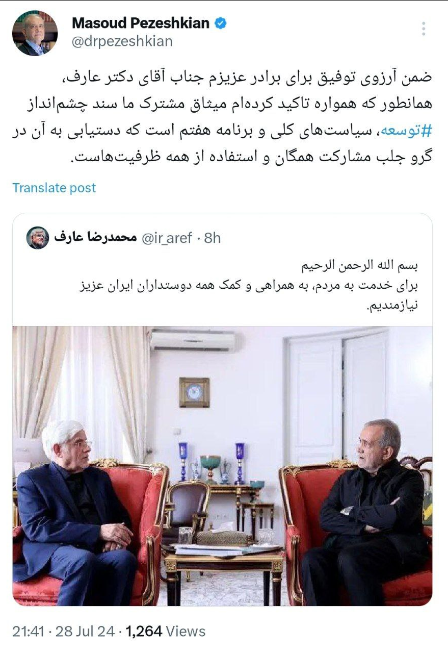 ضمن آرزوی موفقیت برای برادر عزیزم جناب آقای دکتر عارف، همانطور که همیشه تاکید داشته ام، میثاق مشترک ما سند چشم انداز توسعه، سیاست های کلی و برنامه هفتم است که تحقق آن منوط به مشارکت همگان و استفاده از همه توانمندی هاست. “